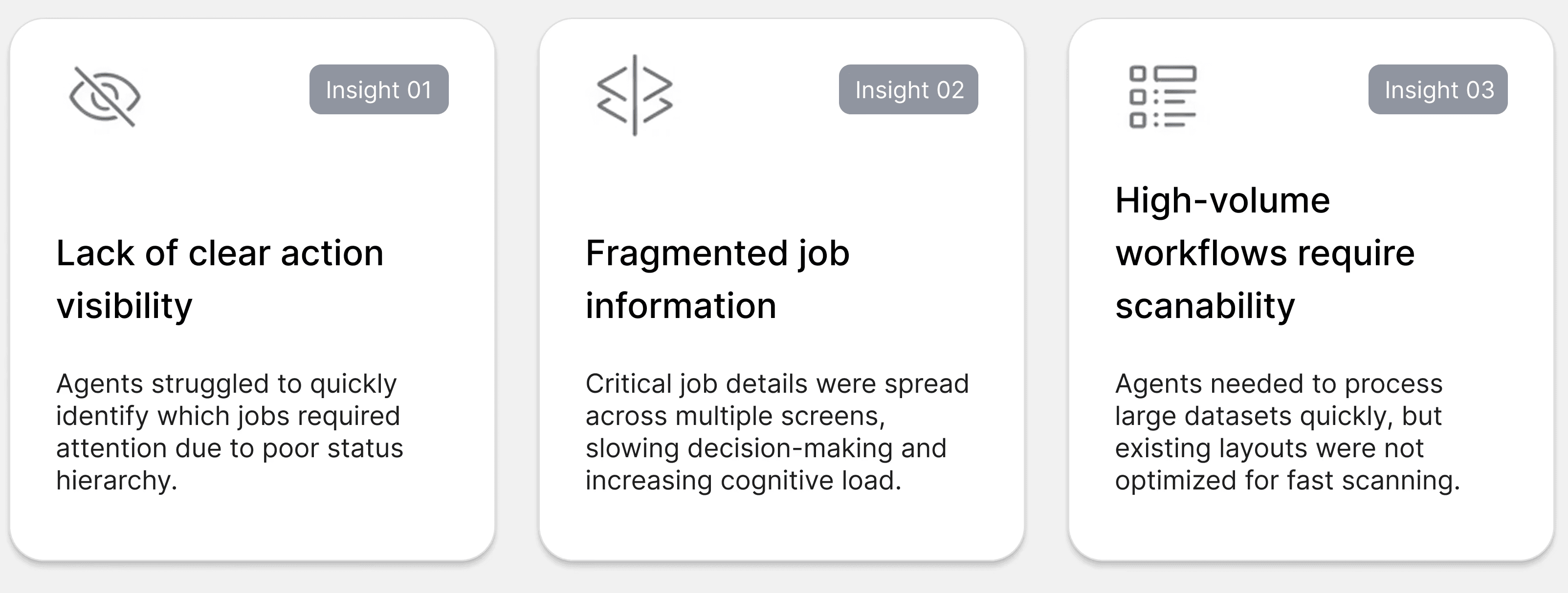 A key insight: many systems suffer from poor information hierarchy, making it difficult to identify what requires action. Improving clarity—especially around job status—became a primary focus.