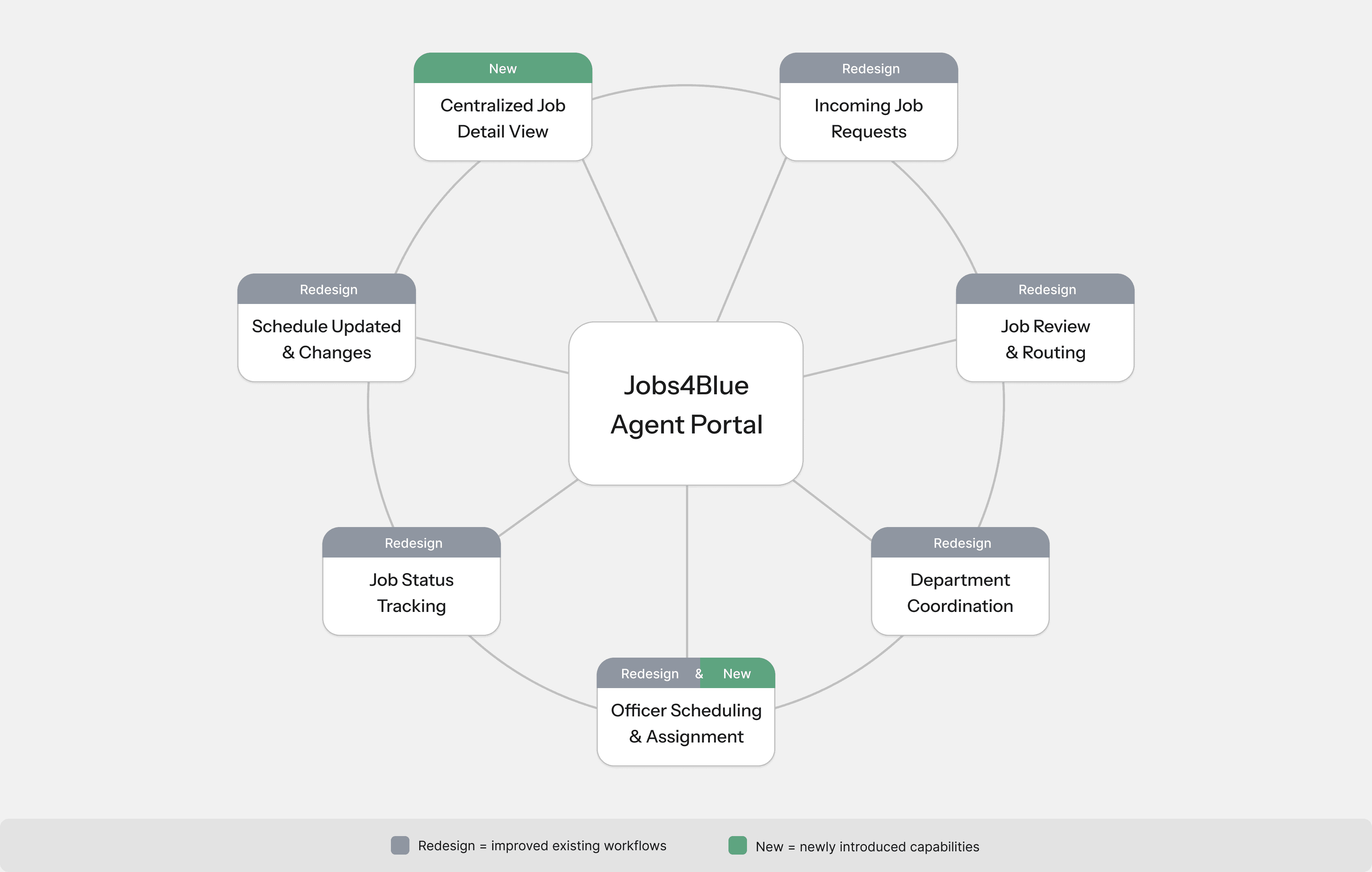 The Jobs4Blue Agent Portal is an internal platform for managing extra-duty job requests connecting enterprise clients with off-duty police officers (ex: Verizon hiring traffic control officers for construction work on a highway).